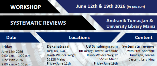 A team of subject librarians from Mainz University Library will guide participants in developing effective search strategies for systematic reviews. Participants will learn advanced search techniques such as truncation, phrase searching, controlled vocabulary, Boolean operators, and the use of filters. They will work with key databases, including Web of Science and other databases available through the EBSCO platform. The workshop will also introduce forward and backward citation searching, methods for deduplicating results, the practical use of AI-supported tools, and other resources that may support the systematic review process.